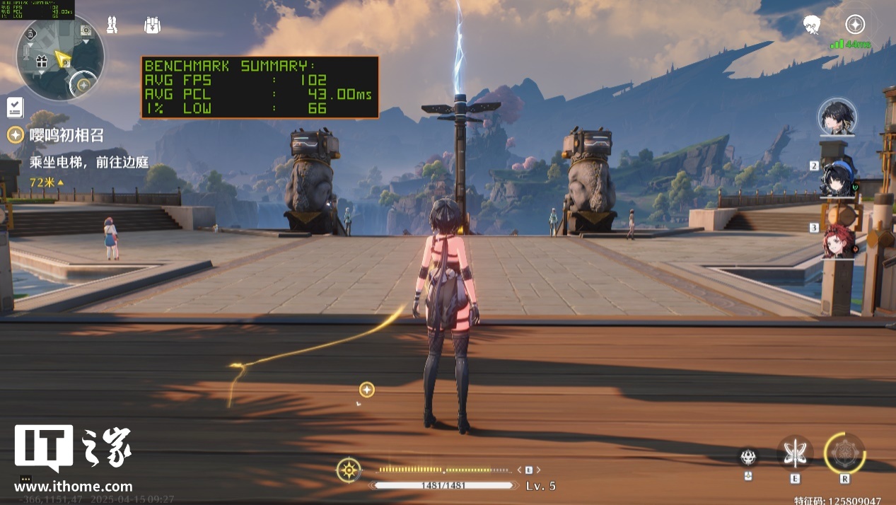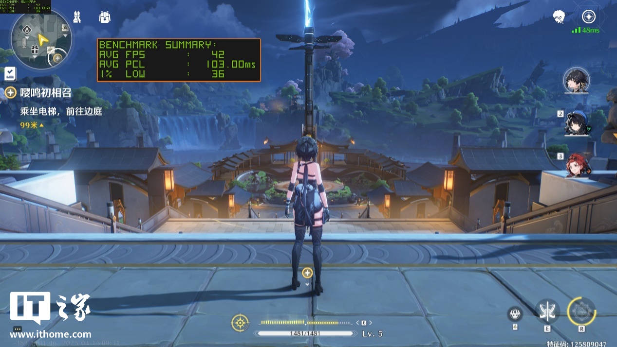 鸣潮作为一款开放世界游戏,默认锁 120Hz,所以 1080P 和 2K 分辨率下即使开启光追,压力也不算大,1080P 分辨率 + 窗口模式下跑图能到 100 帧以上,所以我们直接上强调切换到 4K 分辨率 + 全屏模式,在最高画质和光追选项加持下,游戏的平均帧数来到了 42 帧,延迟高达 103ms,1% Low 帧更是只有 36 帧,游戏体验比较难受。