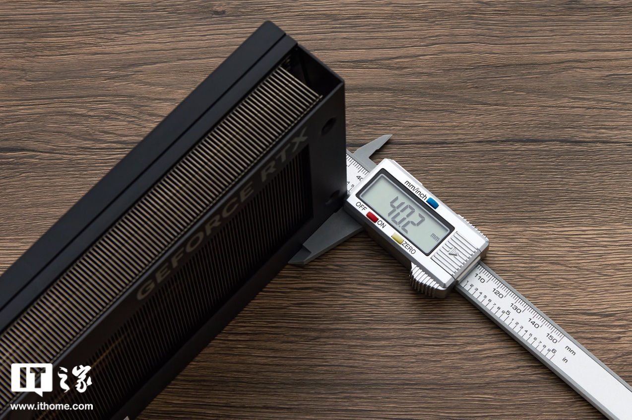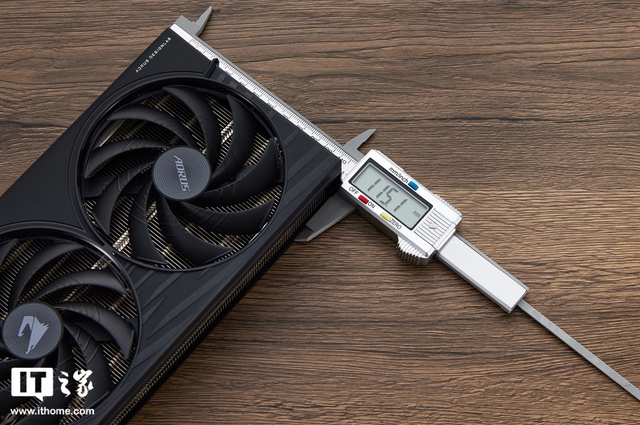 尺寸方面,技嘉 AORUS GEFORCE RTX 5060 Ti ELITE 16G 虽然是三风扇卡,但重量较为轻盈,一点也不厚重。官方三围数据分别是 329*128*41mm,IT之家进行了实际测量,供大家参考,上秤重量则是 1kg。