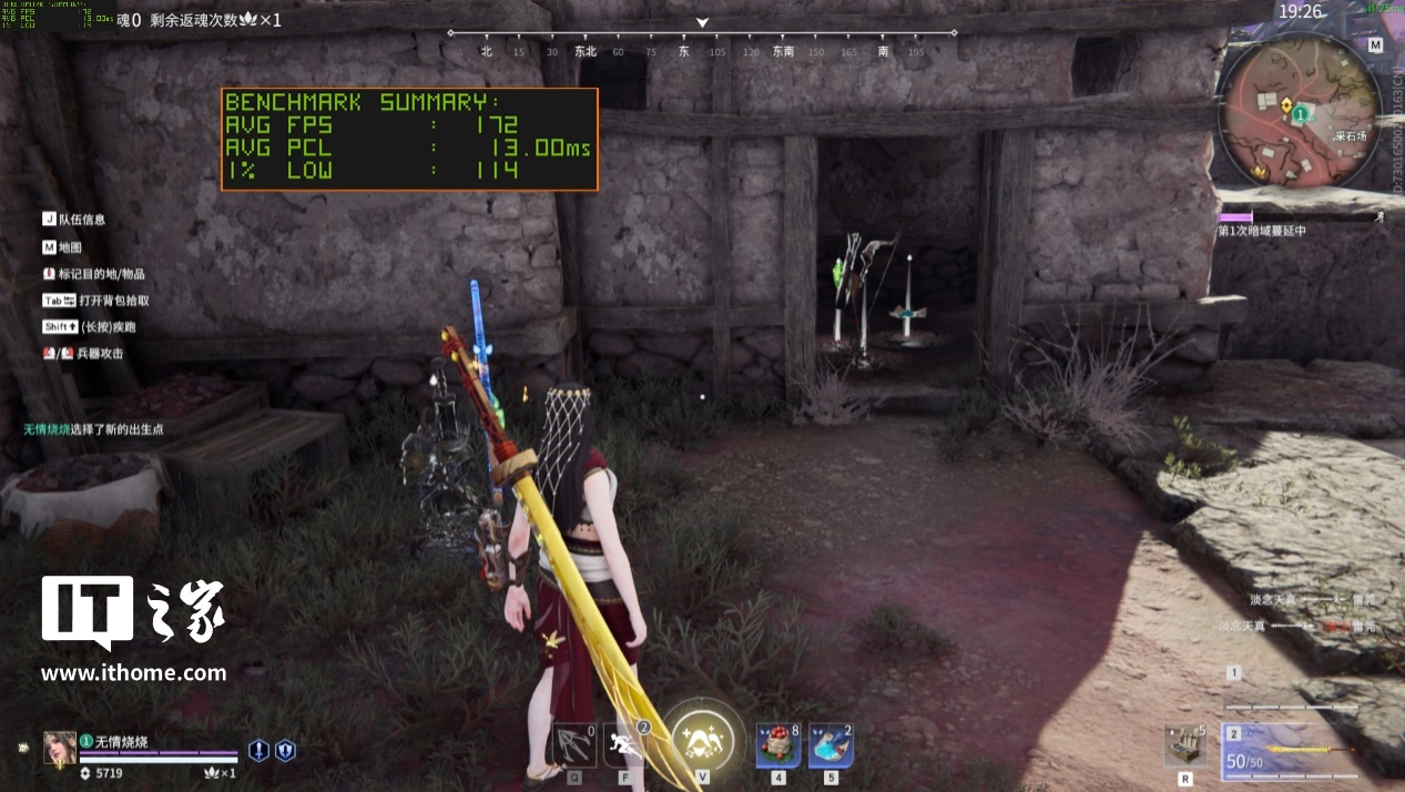 首先,RTX 5060 Ti 在 1080P 分辨率 + 最高画质下,游戏平均帧数为 172 帧,1% Low 帧 114 帧,平均延迟 13ms;