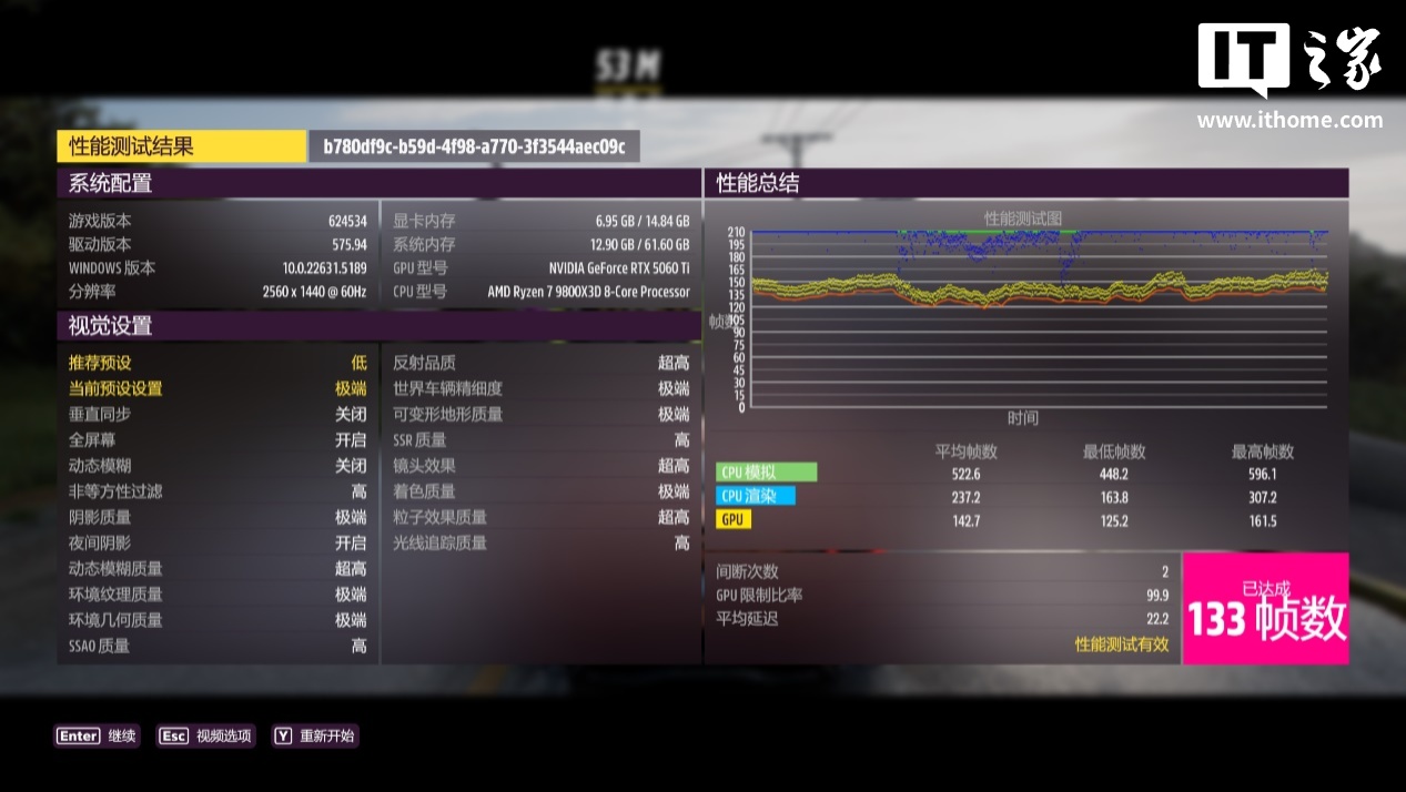 • RTX 5060 Ti 在 2K 分辨率 + 极端画质下,游戏平均帧数 133 帧,1% Low 帧 114 帧;