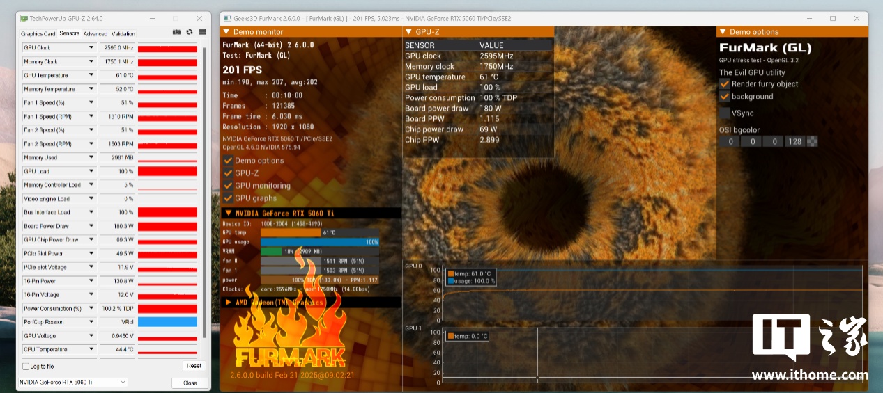 而本次测试的技嘉 AORUS GEFORCE RTX 5060 Ti ELITE 16G 显卡在烤机 10 分钟后,GPU 功耗稳定在 180W 左右,相比 RTX 4060 Ti 只高了 20W。烤机时的 GPU 主频在 2600MHz 左右,与此同时显卡核心温度只有 61℃,显存温度更是低至 52℃,这比我们评测过的 RTX 4060 Ti 显卡都能低上至少 5℃,能耗表现更为出色。