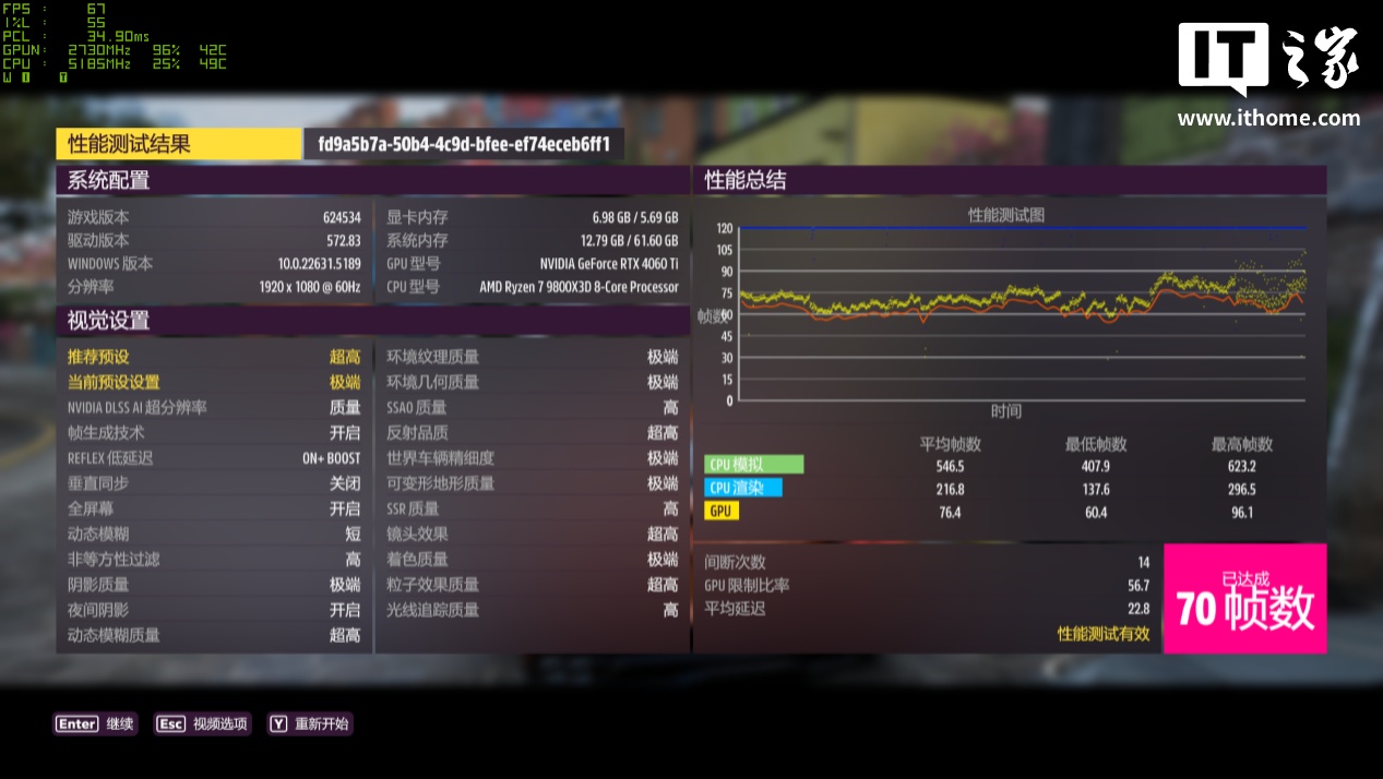 • RTX 4060 Ti 在 1080P 分辨率 + 极端画质 + 补帧(DLSS 质量 + 帧生成)下,游戏平均帧数 71 帧,1% Low 帧 45 帧;