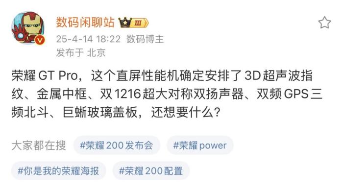 根据 @数码闲聊站曝光的信息来看,荣耀 GT Pro 在核心配置上,预计将搭载高通骁龙 8 至尊版处理器,辅以 LPDDR5X Ultra 内存与 UFS4.1 闪存。外围规格更是“旗舰级硬件全家桶”,包括 1216 超大对称双扬声器、3D 超声波指纹解锁、荣耀巨犀玻璃、双频 GPS + 三频北斗导航,每一项都对标顶级旗舰。