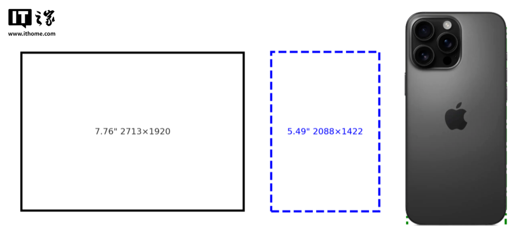 根据最新的 7.76 英寸和分辨率信息计算,折叠屏 iPhone 的外屏要更“长”一点,内屏比两个外屏加起来要更“宽”一点,是不是很合理?