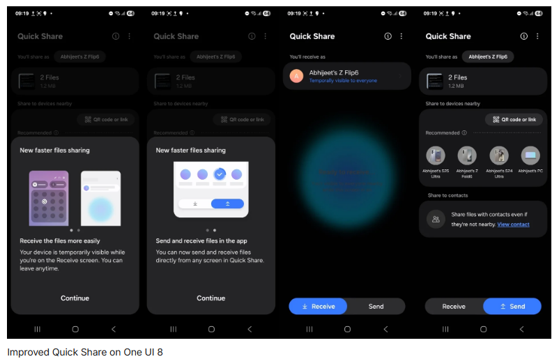 One UI 8 改进 Quick Share 功能,菜单分为“接收”和“发送”两个选项,用户可临时让设备对其他 Android 设备可见,用完即关闭,相比之前的永久可见或 10 分钟限制更加灵活。