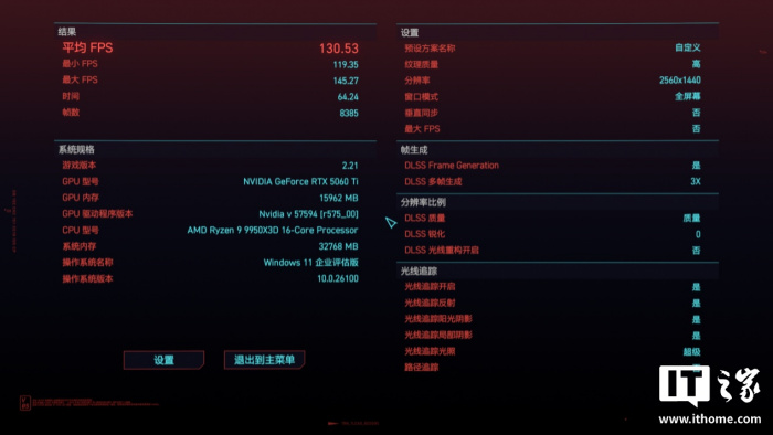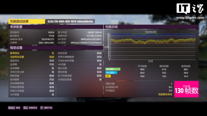 RTX 5060 Ti 在 2K 分辨率 + 极端画质下,游戏平均帧数 130 帧,1% Low 帧 99;