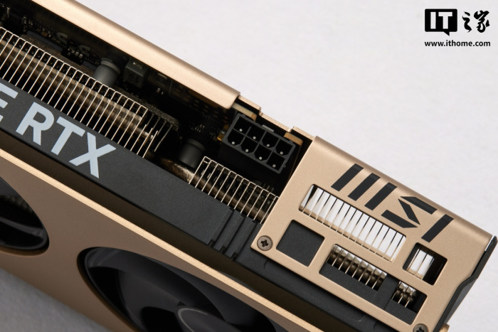 显卡背面部分为金色涂装的铝合金背板,左侧印有黑色的 MSI 以及 GEFORCE RTX Logo 装饰,右侧散热开孔则是和蒙德里安《红、蓝、黄的构成》的大色块近似,极为简洁。