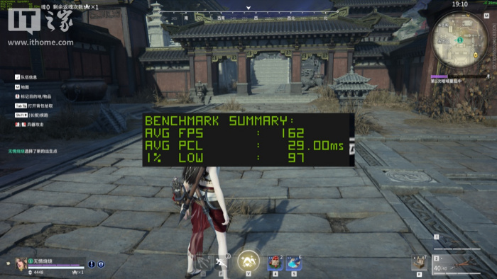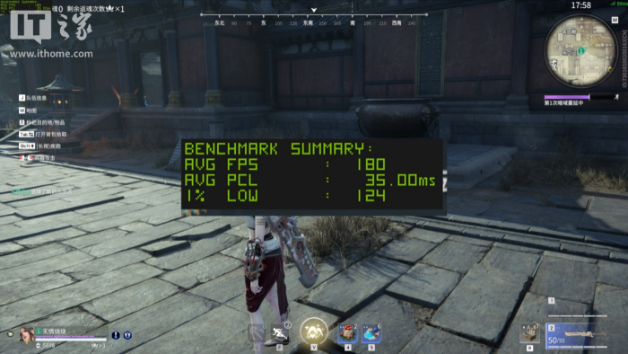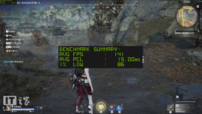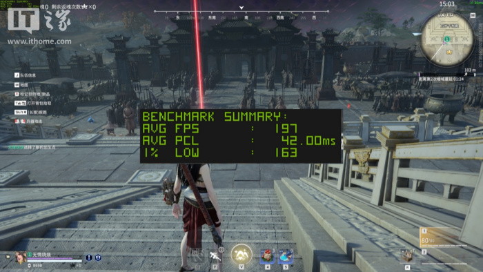实测环节我们还是以竞技游戏开场,《永劫无间》前不久已经支持了 DLSS 4 多帧生成功能,恰好可以作为一个典型竞技游戏,来测试下 DLSS 4 的性能提升和延迟表现如何。首先,RTX 5060 Ti 在 2K 分辨率 + 最高画质下,游戏平均帧数为 180 帧,1% Low 帧 136 帧,平均延迟 23ms;
