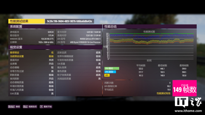 RTX 5060 Ti 在 1080P 分辨率 + 极端画质下,游戏平均帧数 149 帧,1% Low 帧 118;