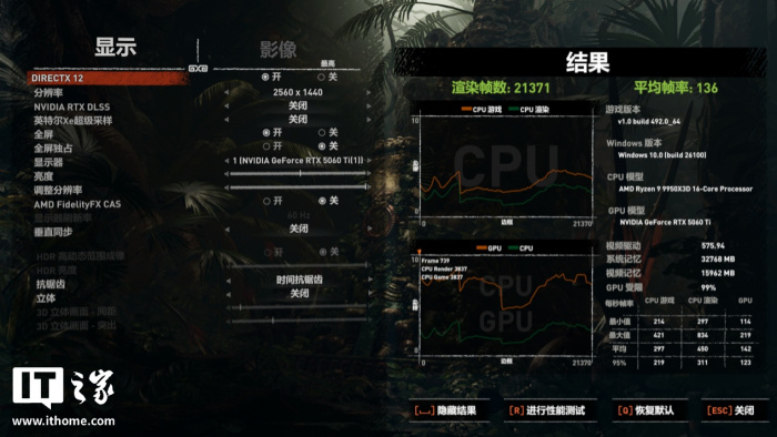 RTX 5060 Ti 在 2K 分辨率 + 最高画质下,游戏平均帧数 136 帧,1% Low 帧 68 帧;