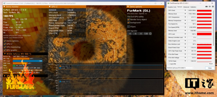 首先是烤机测试,微星 GeForceRTX 5060 Ti 16G INSPIRE 2X 显卡在烤机 20 分钟后,GPU 功耗稳定在 180W 左右,相比 RTX 4060 Ti 高了 20W。烤机时的 GPU 主频在 2430 MHz 左右,与此同时显卡核心温为 67.5℃,显存温度则是 60℃,相比IT之家此前测过 3 风扇的 RTX 5060 Ti 会高 5°C 左右,但这个温度基本不会影响常温下显卡的性能释放。