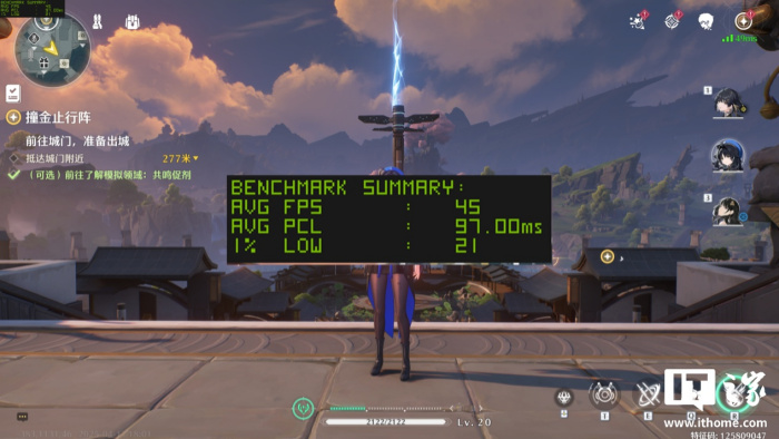 鸣潮作为一款开放世界游戏,默认锁 120 帧,所以 1080P 和 2K 分辨率下即使开启光追,压力也不算大,1080P 分辨率 + 窗口模式下跑图能到 100 帧以上,所以我们直接上强调切换到 4K 分辨率 + 全屏模式,在最高画质和光追选项加持下,游戏的平均帧数来到了 45 帧,延迟高达 97ms,1% Low 帧更是只有 21 帧,游戏体验较差。