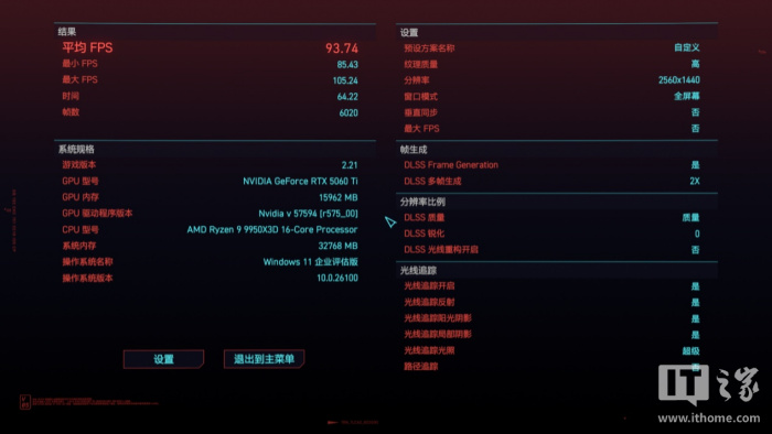 RTX 4060 Ti 在 1080 分辨率 + 极致画质下,游戏平均帧数为 94 帧,1% Low 帧 75 帧;