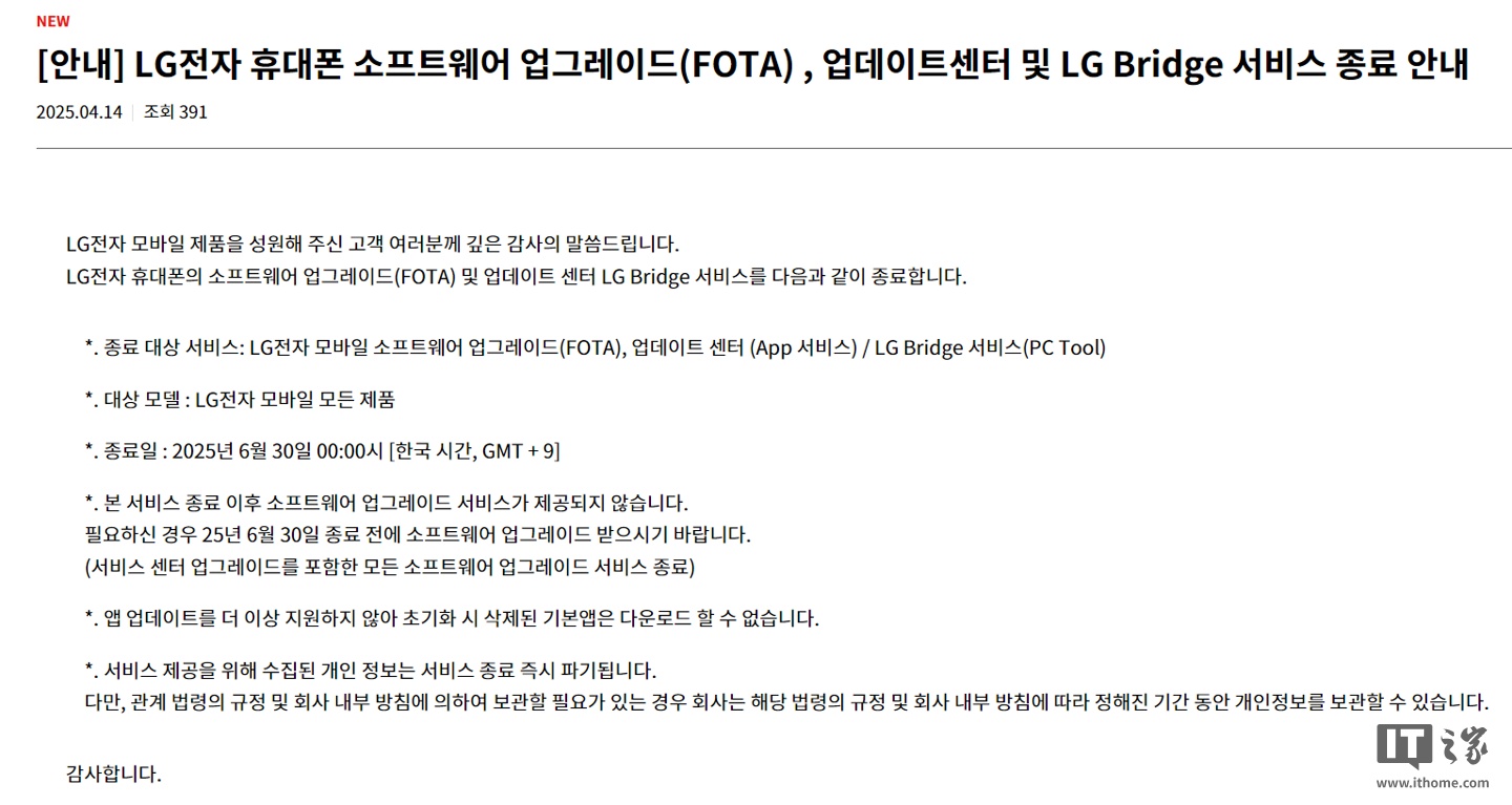 IT之家 4 月 18 日消息,LG 电子官网 4 月 14 日发布公告,将于 6 月 30 日终止软件升级(FOTA)和更新中心 LG Bridge 服务。