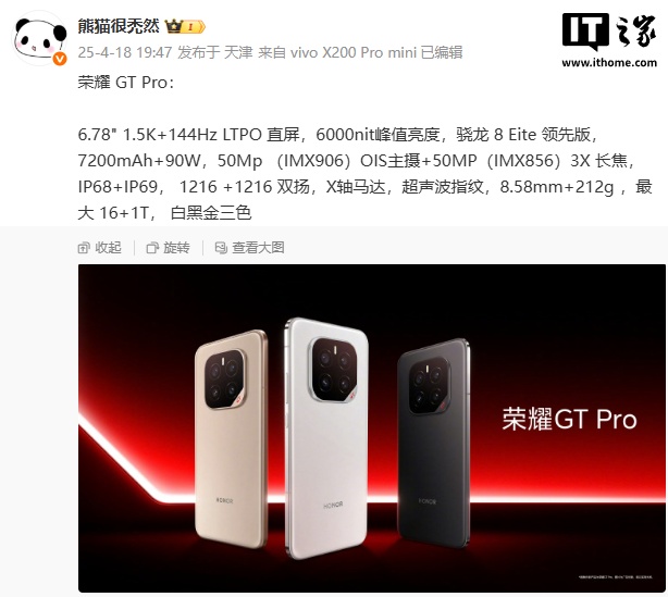 IT之家 4 月 18 日消息,荣耀 GT Pro 手机将于 4 月 23 日 14:30 发布,博主 @熊猫很禿然 今日曝光了这款新机的主要参数: