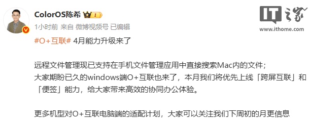 IT之家 4 月 18 日消息,ColorOS 设计总监陈希今日发文称 O+ 互联 4 月能力升级来了,远程文件管理现已支持在手机文件管理应用中直接搜索 Mac 内的文件。