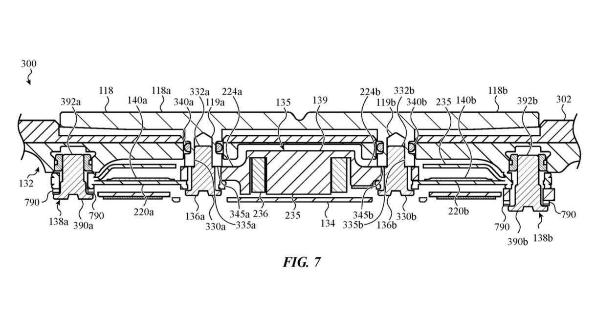 根据专利描述,Bongo 项目的触觉按钮设计依赖于柔性结构和应变计来感知压力变化。一旦检测到按压,电信号会传输至“Bongo Haptic Engine”,通过电磁阻尼电机(由铁磁核心和铜线圈组成)产生振动反馈,与常规 Taptic Engine 的工作原理类似。