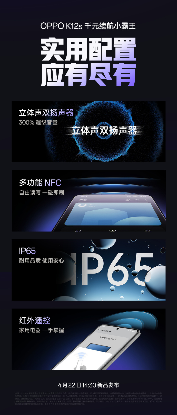 IT之家 4 月 19 日消息,OPPO K12s 手机将于 4 月 22 日 14:30 发布,号称“千元续航小霸王”。最新预热显示,这款新机将提供立体声双扬声器、多功能 NFC、IP65、红外遥控等配置。