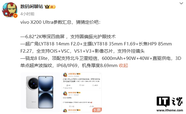 文章来源于互联网:IT之家-vivo X200 Ultra 手机参数汇总:2K 等深四曲屏 + 骁龙 8 Elite,4 月 21 日发布