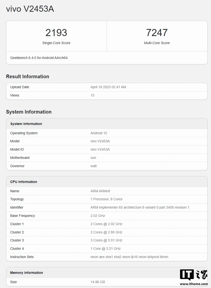 IT之家 4 月 19 日消息,iQOO Z10 Turbo 系列机型已开启预约,将于本月发布。IT之家注意到,iQOO Z10 Turbo Pro(V2453A)昨日出现在了 Geekbench 上,测试次数达到了 28 次。