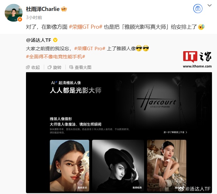 IT之家 4 月 20 日消息,荣耀 GT 系列产品经理 @汤达人TF 今日发文透露,荣耀 GT Pro 手机在影像方面将支持雅顾人像拍摄,即「雅顾光影写真大师」功能。