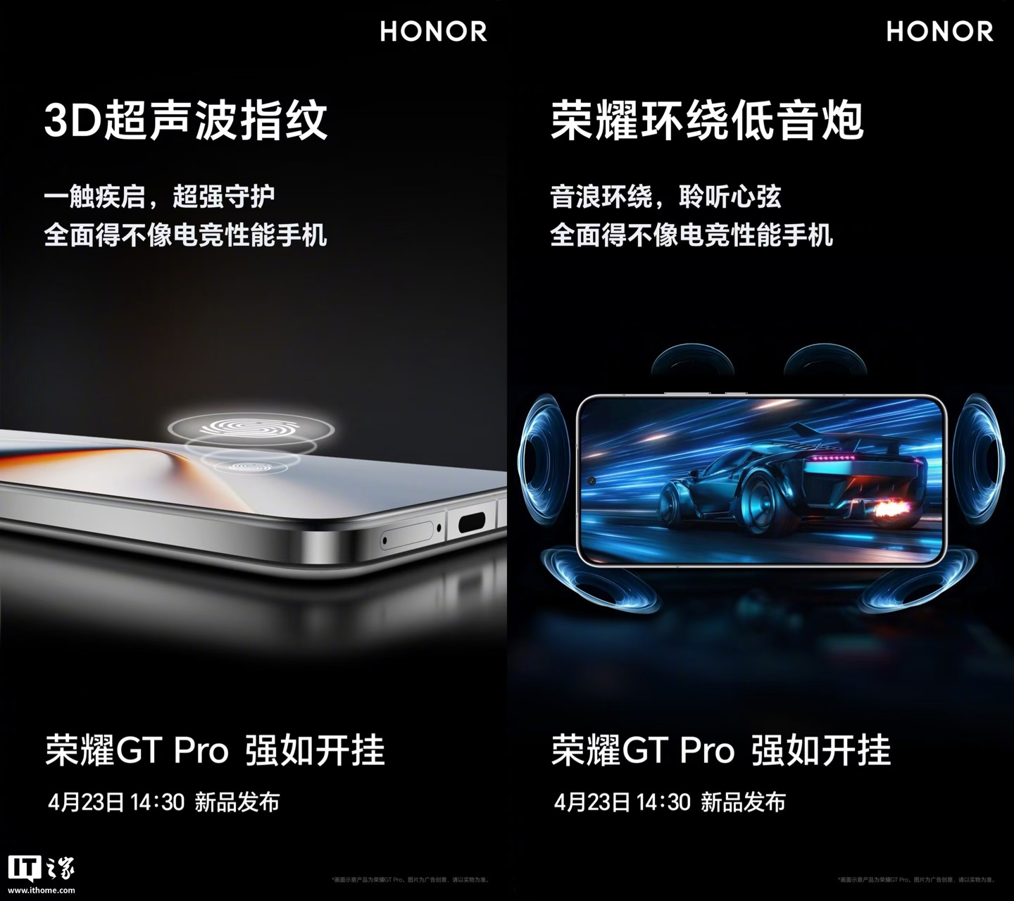 据IT之家今日早些时候报道,荣耀 GT Pro 手机全新升级 3D 超声波指纹,宣称“无惧水汗油”。新机还内置荣耀环绕低音炮,预计将支持环绕音效等功能特性。