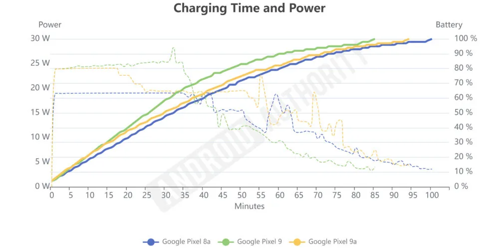不过,测试显示这款机型需配合支持 PPS 协议的充电器才能实现 25W 峰值功率,如果只是用去年的 PD 充电器,则 Pixel 9a 充电功率将被限制在 18W。