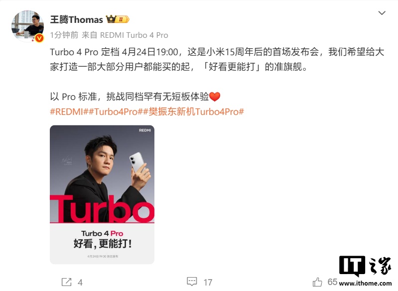 IT之家 4 月 21 日消息,小米中国区市场部总经理、REDMI 品牌总经理王腾今日宣布:REDMI Turbo 4 Pro 定档 4 月 24 日 19:00,这是小米 15 周年后的首场发布会。