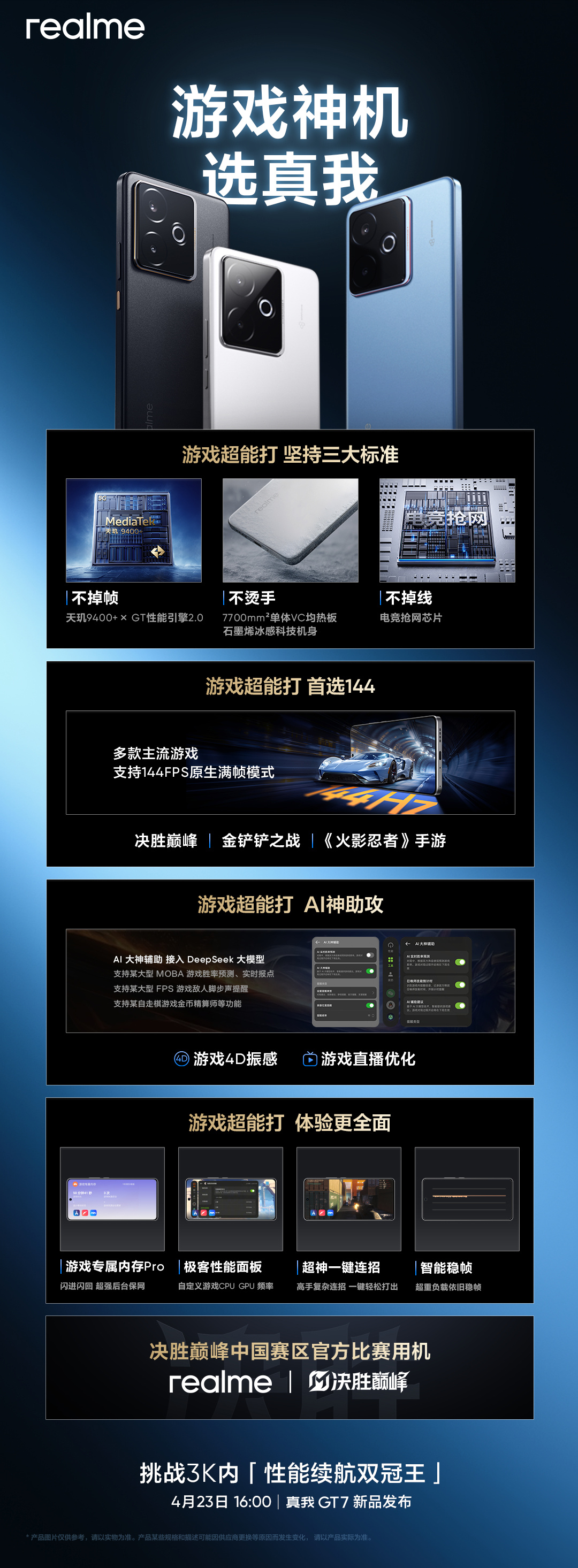 IT之家 4 月 21 日消息,realme 真我 GT7 新品发布会将于 4 月 23 日 16:00 举行。目前已经确认,新机将首批搭载天玑 9400+ 旗舰芯片,并且升级了全新 GT 性能引擎 2.0 ,搭载芯片级内核技术,宣称“无限稳帧、不挑游戏”。
