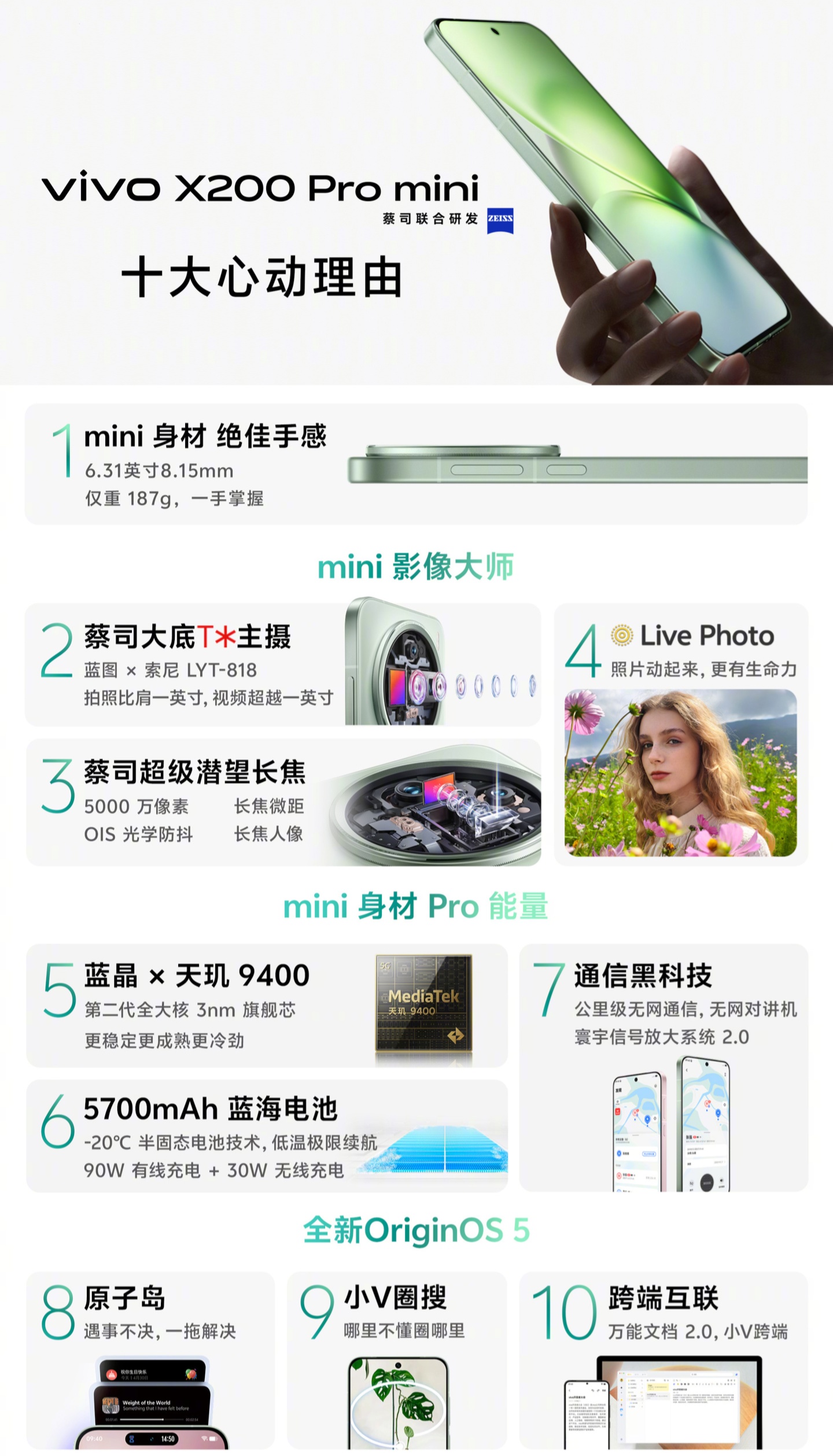 这款“mini 机型”在保持“Pro 配置”不缩水的前提下实现了 6.31 英寸纤薄机身,厚 8.15mm,重量约为 187g,还有蔡司大底 T * 主摄和蔡司潜望超级长焦,搭载全新 Origin OS5,支持 Live Photo。