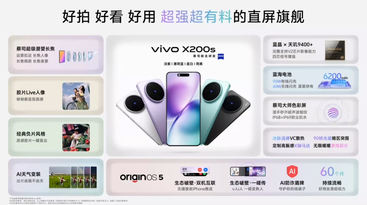 vivo X200s 手机预装 OriginOS 5、搭载天玑 9400+ 处理器、配备超声波指纹 + 蔡司大师色彩屏,屏幕局部亮度峰值达 5000nit。新机电池容量为 6200mAh,支持 90W 有线快充 + 40W 无线快充、直驱供电。