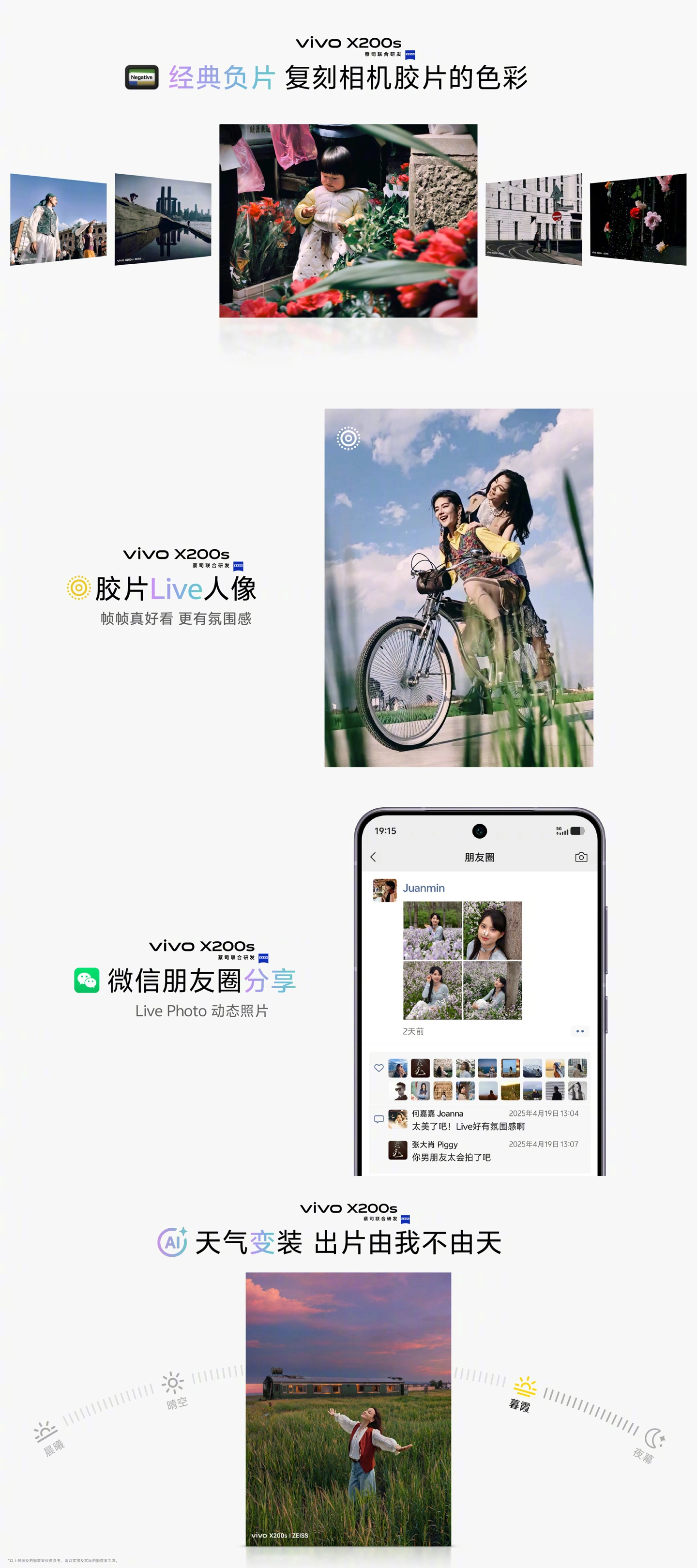vivo X200s 手机新增负片风格滤镜,可复刻胶片相机色彩,宣称“质感大片一键直出”。新机人像模式也支持 LivePhoto 拍摄,同时可叠加胶片风格及其他滤镜。另外,vivo X200s 还支持 AI 天气变装、AI 路人消除、微信朋友圈发布 LivePhoto 等功能。