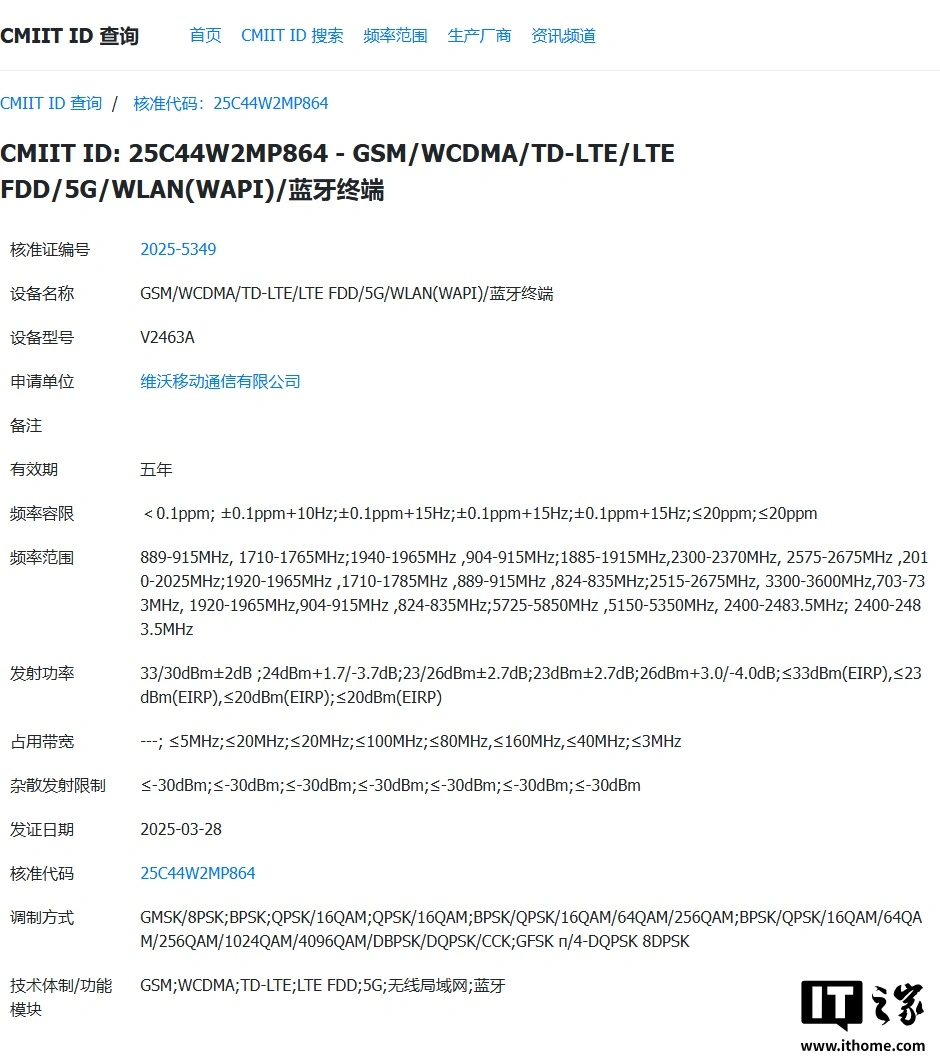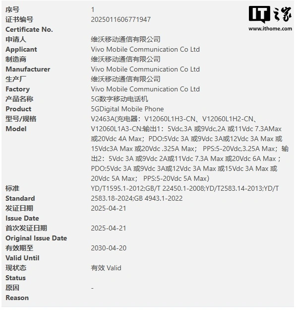 根据 GSMA IMEI 数据库信息,型号 V2463A 手机上市后名称为 iQOO Neo 10S 手机,根据 3C 认证页面信息,显示该机搭配 V12060L1H3-CN、V12060L1H2-CN、V12060L1A3-CN 充电器,支持 120W 快充。