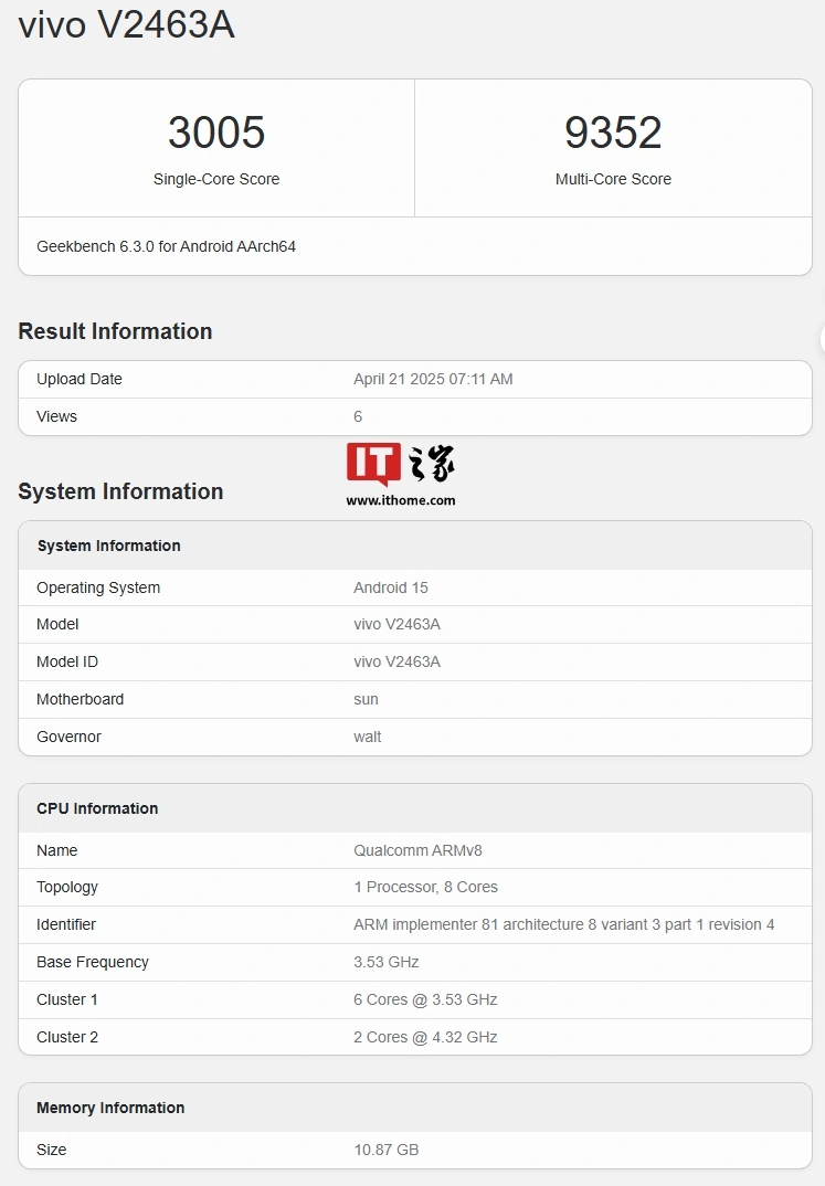 IT之家 4 月 22 日消息,型号为 V2463A 的 vivo iQOO 设备通过中国 3C 和 CMIIT 平台认证,此外现身 GeekBench 跑分库,6.3.0 版本单核成绩为 3005 分,多核成绩为 9352 分。
