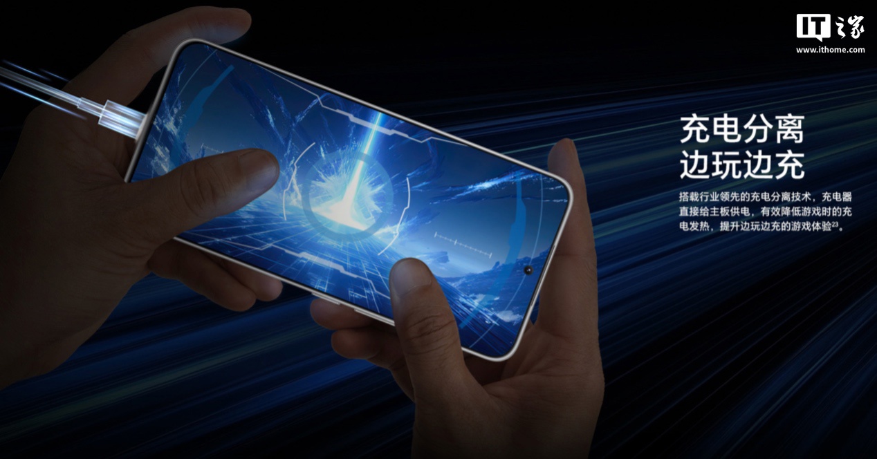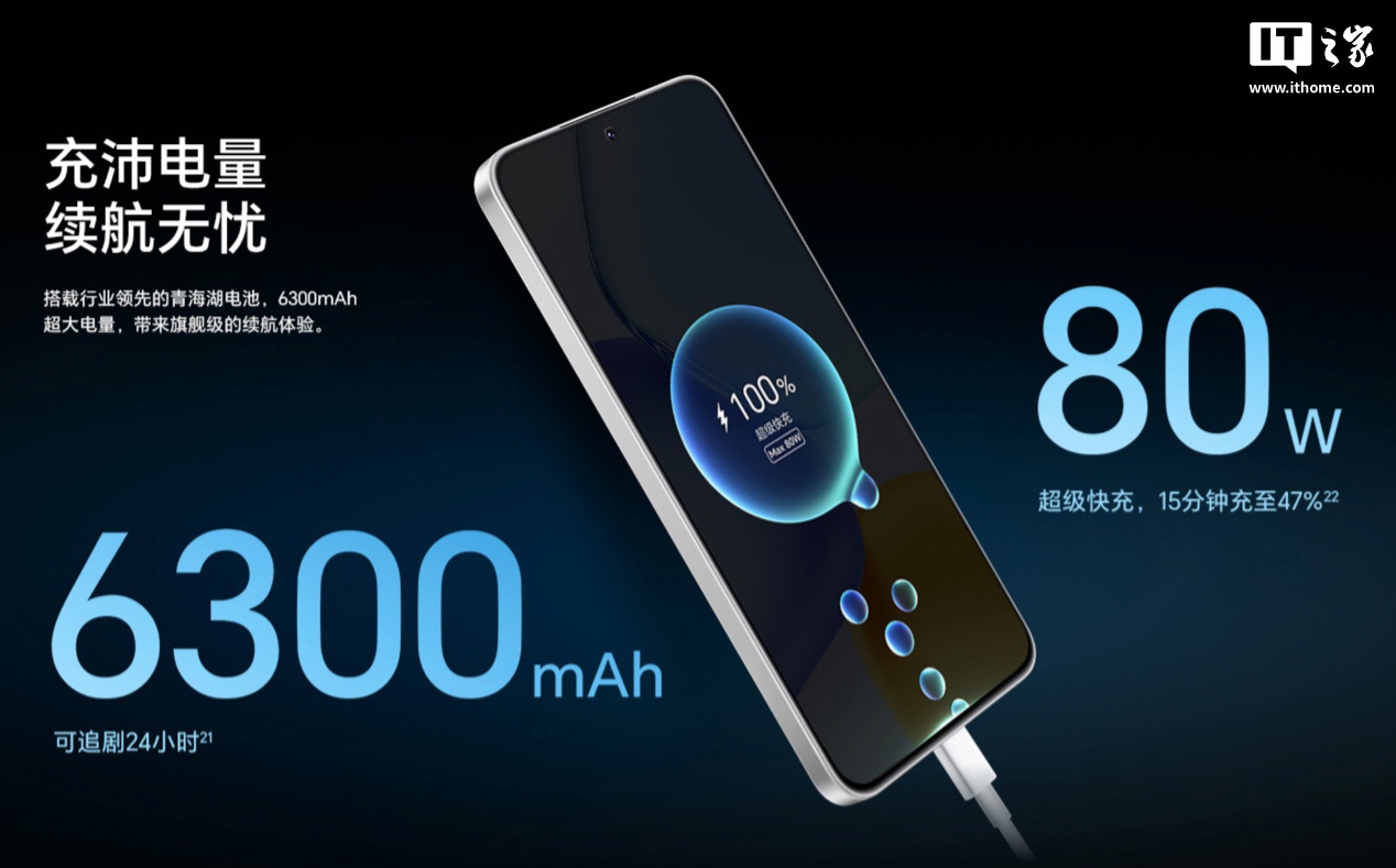 电池方面,该手机搭载 6300mAh 青海湖电池,可追剧 24 小时(荣耀实验室数据),充电功率为 80W,且该手机支持“充电分离”功能,开启该功能后充电器将跳过电池,直接给主板供电,可有效降低游戏时的充电发热,提升边玩边充电场景的体验。