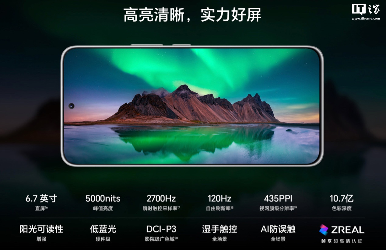 根据荣耀官方所述,该手机屏幕为 6.7 英寸 OLED 直屏,刷新率为 120Hz,支持 DCI-P3 色域,同时官方表示该手机峰值亮度可达 5000 尼特,瞬时触控采样率可达 2700Hz。