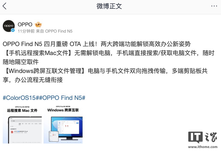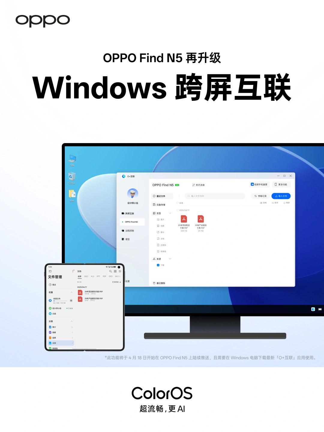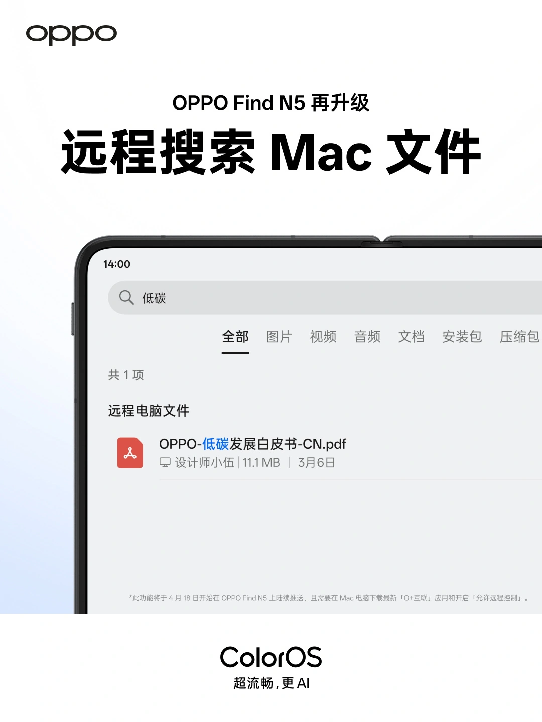 文章来源于互联网:IT之家-OPPO Find N5 手机四月 OTA 更新:Windows 跨屏互联、远程搜索 Mac 文件