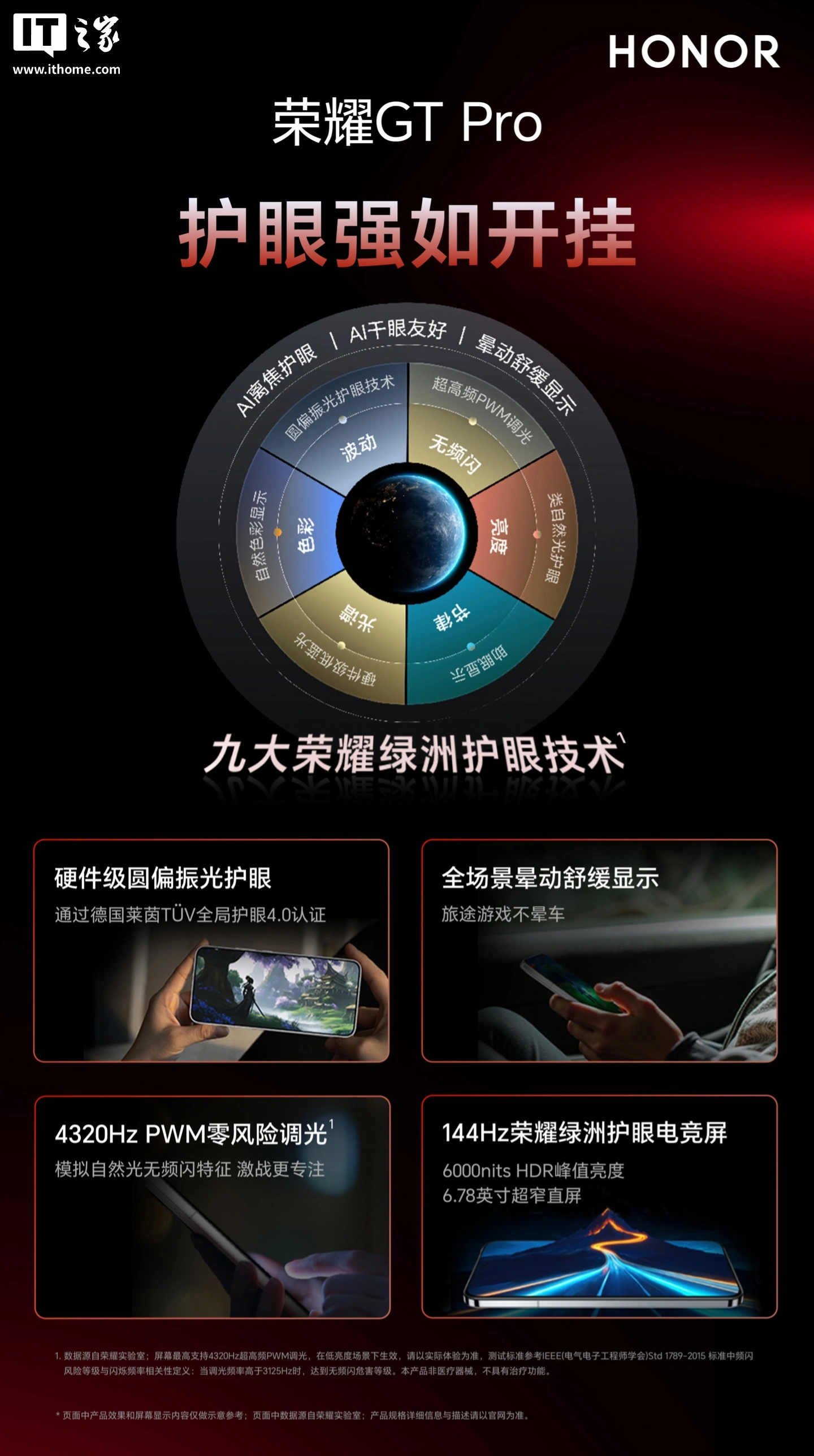 荣耀 GT Pro 配备荣耀绿洲护眼电竞屏,支持九大荣耀绿洲护眼技术。新机支持 4320Hz PWM 零风险调光、硬件级圆偏振光护眼,通过德国莱茵 TÜV 全局护眼 4.0 认证,支持全场景晕动舒缓显示功能。