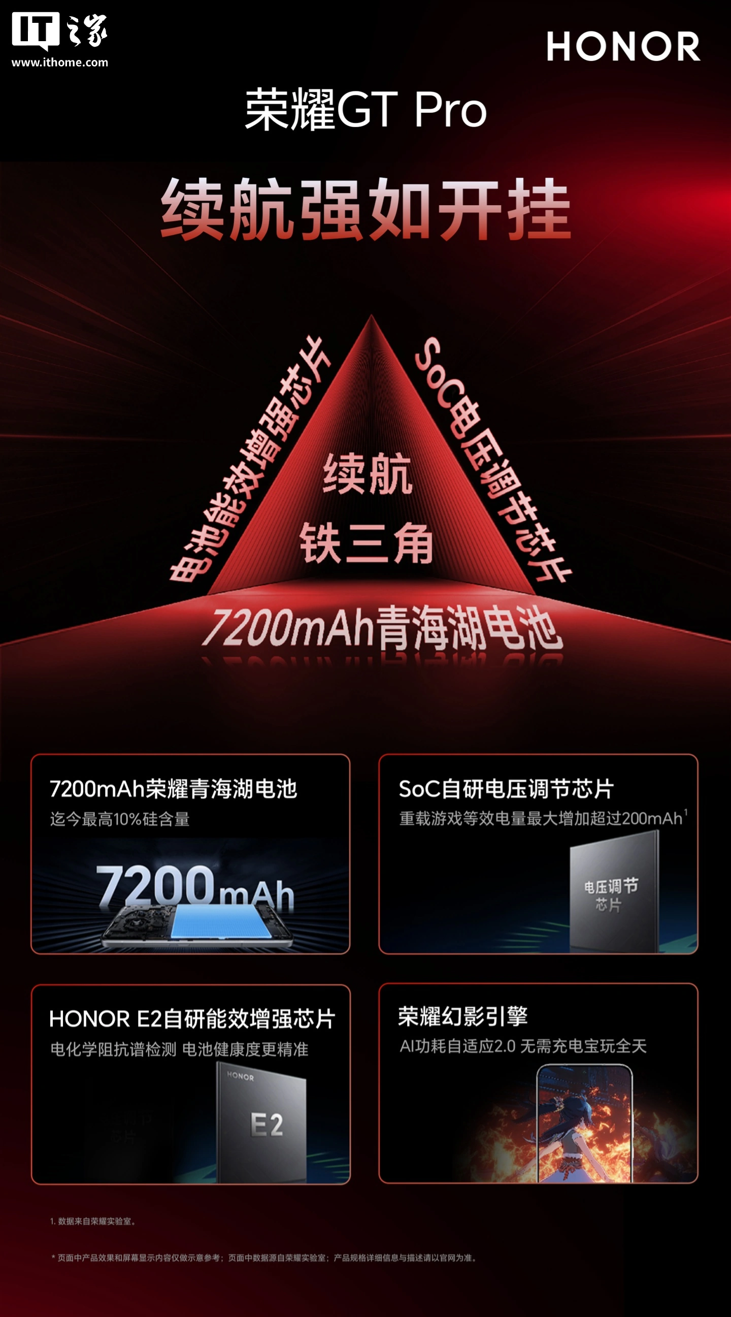 荣耀 GT Pro 还配备 7200mAh 第三代荣耀青海湖电池,支持 90W 有线超级快充,搭配 SoC 自研电压调节芯片 + HONOR E2 自研能效增强芯片,支持荣耀幻影引擎 AI 功耗自适应 2.0,号称“刷新性能旗舰续航纪录”。