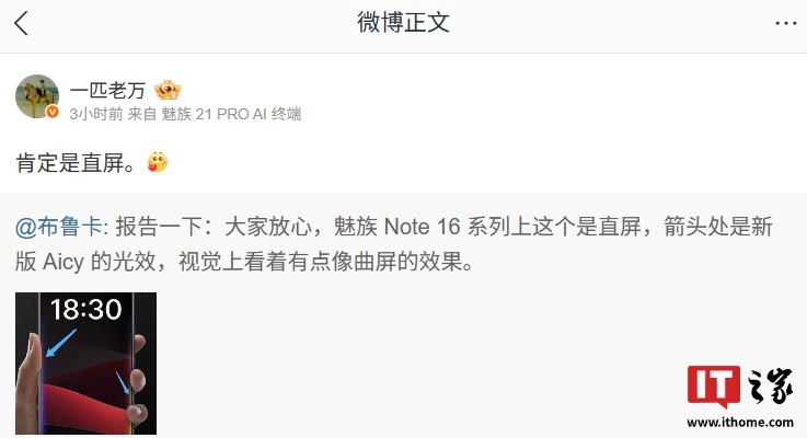 文章来源于互联网:IT之家-星纪魅族万志强:Note 16 系列手机“肯定是直屏”