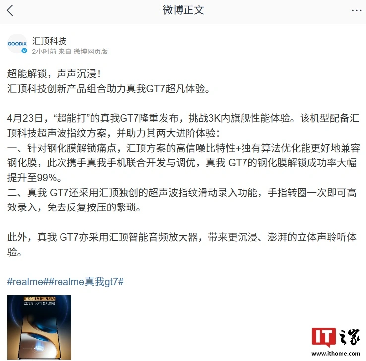 文章来源于互联网:IT之家-真我 GT7 手机采用汇顶科技创新产品组合,含超声波指纹、智能音频放大器
