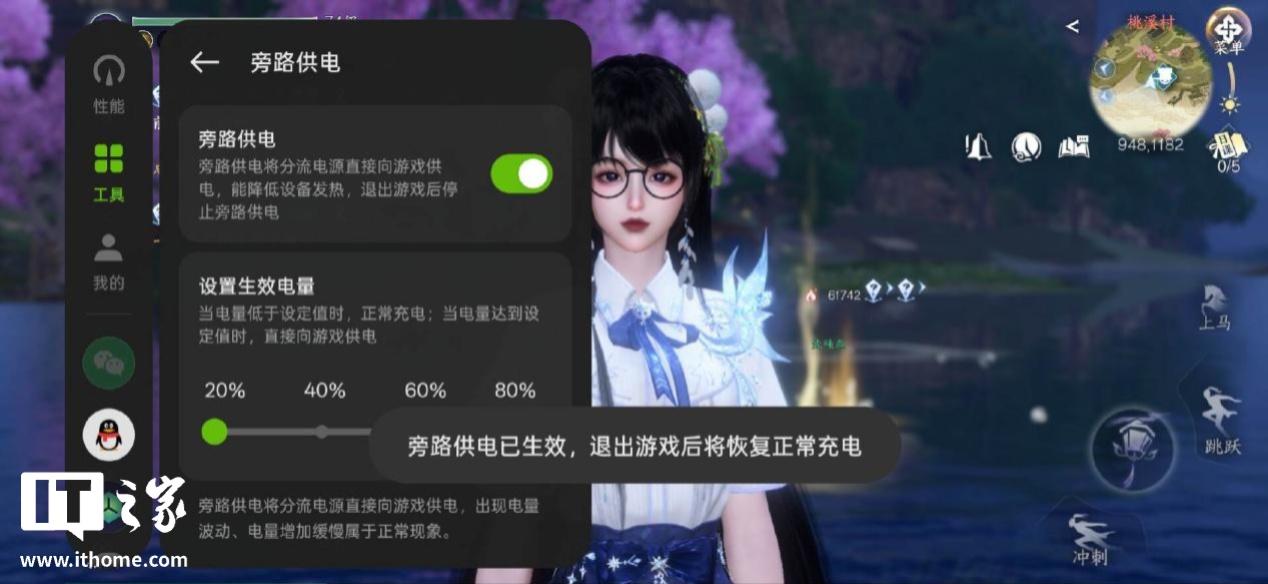 如上图所示,在《逆水寒》游戏中,开启旁路供电后,还可以设置生效电量,比如电量低于设定值时,是正常供电,而达到设定值时,则直接向游戏供电。