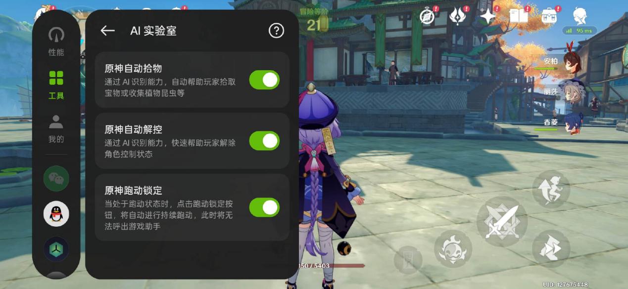 再比如「AI 实验室」,开启后在《原神》游戏中,可以自动拾取物品或者快速帮助玩家解控,还可以跑动锁定等。