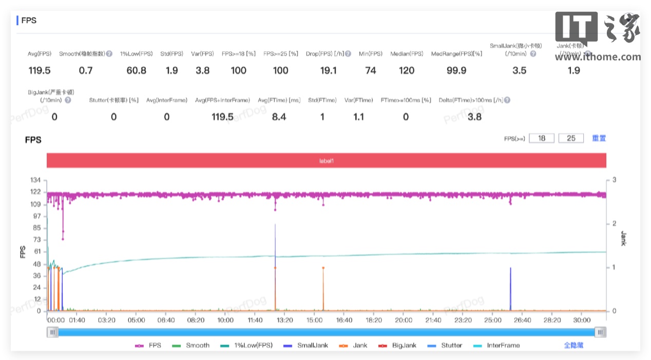 实测成绩如上,30 分钟《和平精英》,平均帧率达到了 119.5fps。