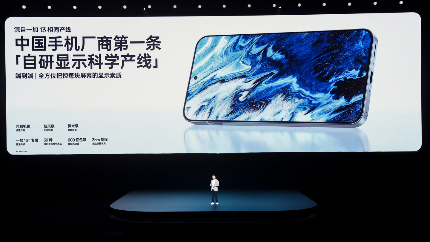 屏幕方面,一加 13T 搭载了旗舰同款屏幕技术,包括旗舰同款自研 Display P2 显示芯片、旗舰同款国内首条自研显示科学产线。新机支持明眸护眼 2.0,全面继承旗舰护眼能力;首发被窝级低亮度,开启后最低亮度可低于 2nit,还支持自研太阳显示技术、雨水触控 2.0 + 手套触控。具体参数方面,一加 13T 屏幕尺寸为 6.32 英寸,分辨率为 2640 x1216,拥有 460 PPI 像素密度,支持 120Hz 刷新率、2400nit 20% APL 亮度、HDR10+、100% DCI-P3 广色域、杜比视界、HDR Vivid。