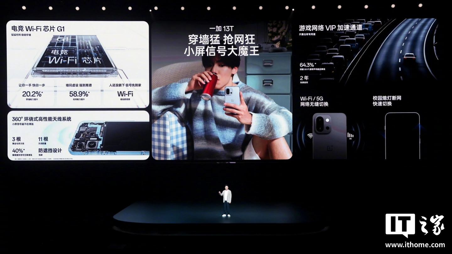 网络方面,一加 13T 搭载电竞 Wi-Fi 芯片 G1,可大幅提升信号穿墙与抢网能力,采用 360° 环绕式高性能天线系统,11 根天线 360° 环绕机身,搭配独家天线防遮挡设计,可降低握持干扰,蜂窝握持信号至高增强 40%,2.4G Wi-Fi 信号至高增强 50%。
