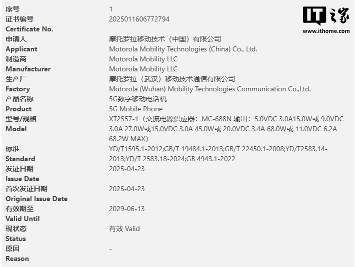 IT之家 4 月 24 日消息,型号为“XT2557-1”的摩托罗拉手机通过中国强制性产品认证(3C 认证),页面信息显示该机搭配 MC-688N 充电器,支持 68W 有线快充。