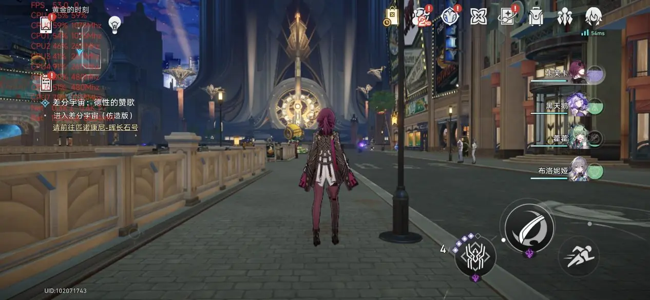 《崩坏:星穹铁道》时至今日依旧是手机游戏中对性能要求最高一档的产品,测试场景依旧选择了匹诺康尼-黄金的时刻,REDMI Turbo 4 Pro 适配的分辨率为 775P。