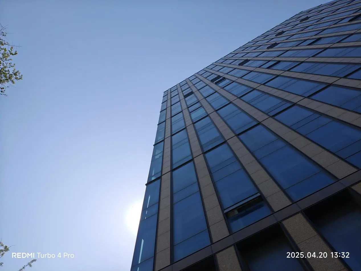 然后是日间大逆光的场景,可以看到 REDMI Turbo 4 Pro 直出的照片在动态范围方面表现也不错,背光的楼房亮度足够,也没有明显的噪点,细节清晰,而亮部的天空色彩也没有过曝和失真,蓝色的过渡很柔和。