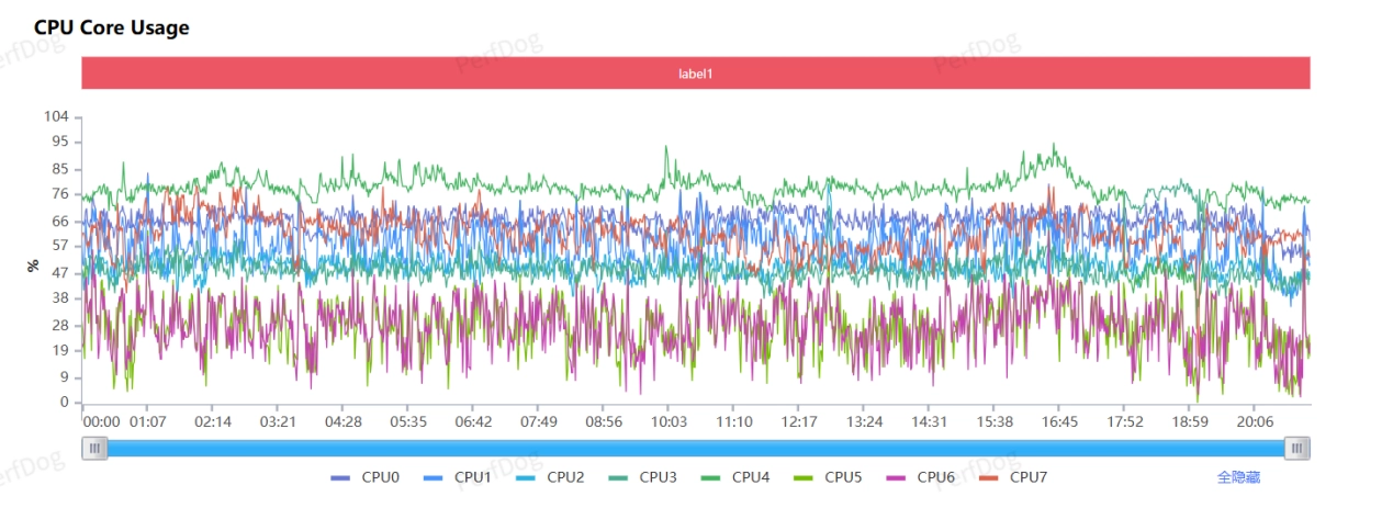 通过性能狗的 CPU 占用率和 CPU 频率图表可以看到,游戏中只有 1 个 CPU 核心利用率超过了 60%,并且 CPU 频率也保持在 2.5GHz 的高温,其他核心的使用率只有 35% 甚至更低,核心频率自然也不高,也就是说在 CPU 调度上 REDMI Turbo 4 Pro 对于《崩坏:星穹铁道》比《原神》更加保守。